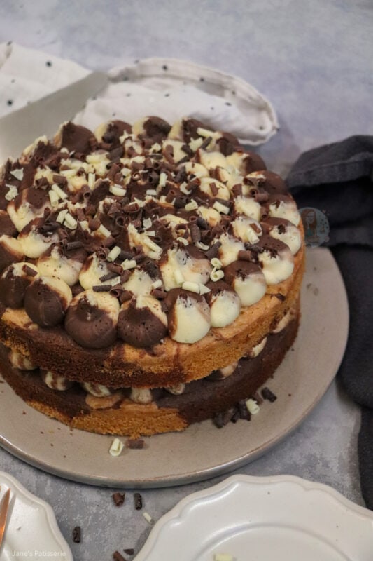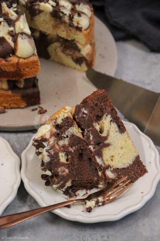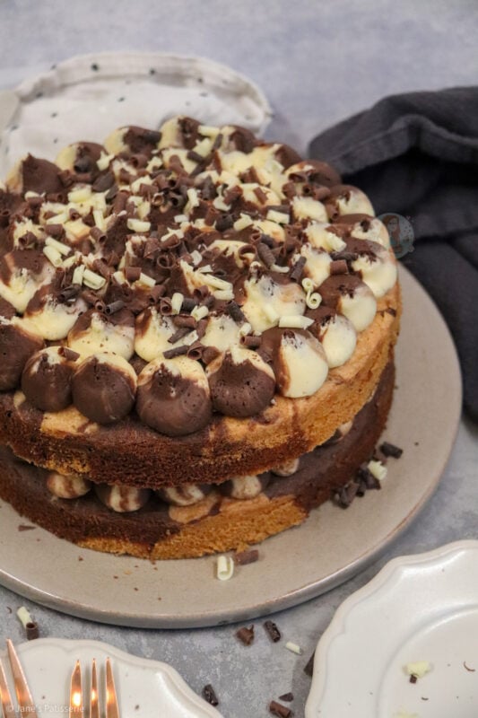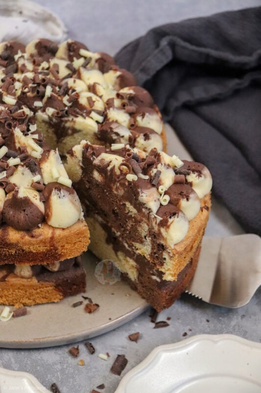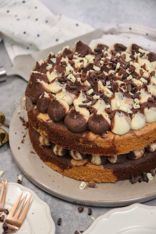 A simple two layer vanilla and chocolate marble cake with chocolate and vanilla swirled buttercream frosting and more