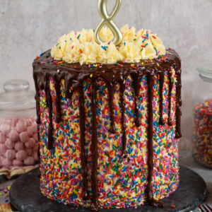 A delicious 8″ vanilla sprinkle cake, with vanilla buttercream frosting and covered in sprinkles – to celebrate my blogs 8th birthday!!