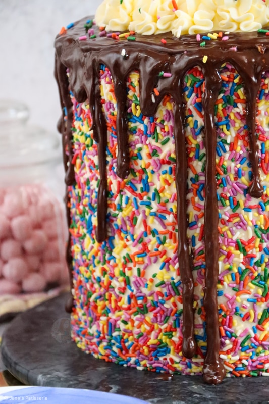 Luckily, because you are covering the sides in sprinkles, it doesn’t have to be perfect. You still want the cakes to be level and straight, and as smooth as possible, but it doesn’t have to be pristine like a regular drip cake as it’s all getting hidden anyway.