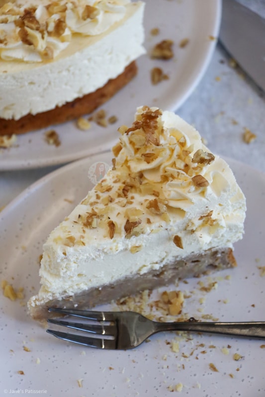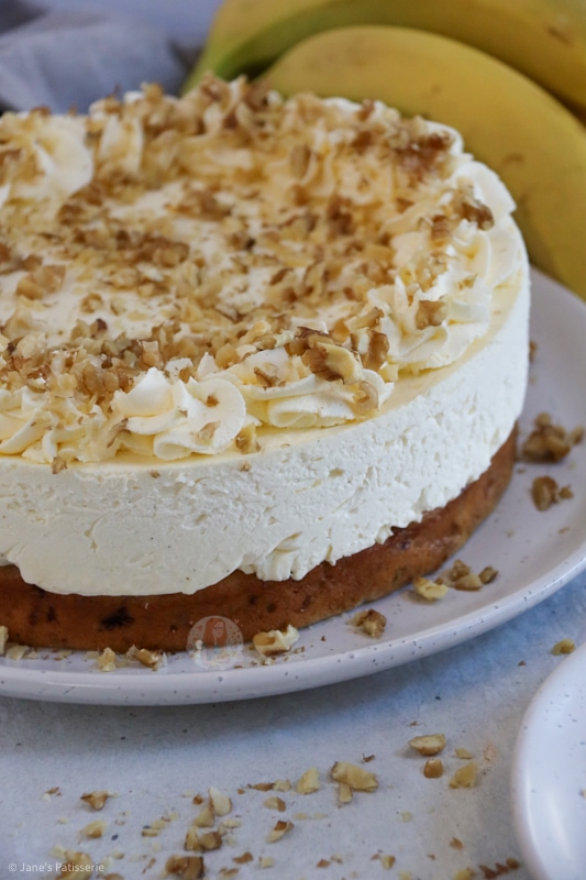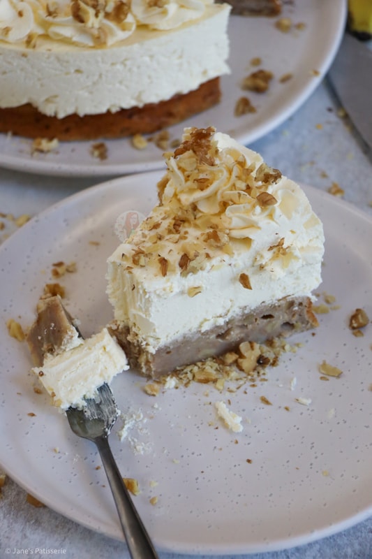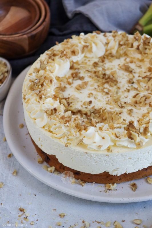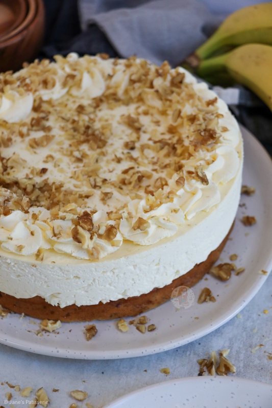 Because the main part of this show is the banana bread being topped with cheesecake the decoration was quite tame for me, but that’s no bad thing. I used some double cream whipped with icing sugar to soft peaks and piped into swirls around the edge, and then added on some chopped walnuts for extra decor.