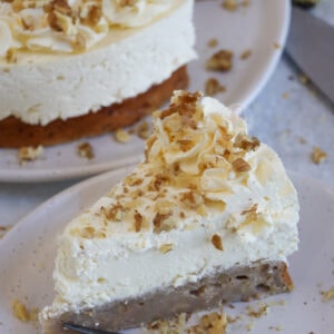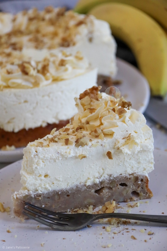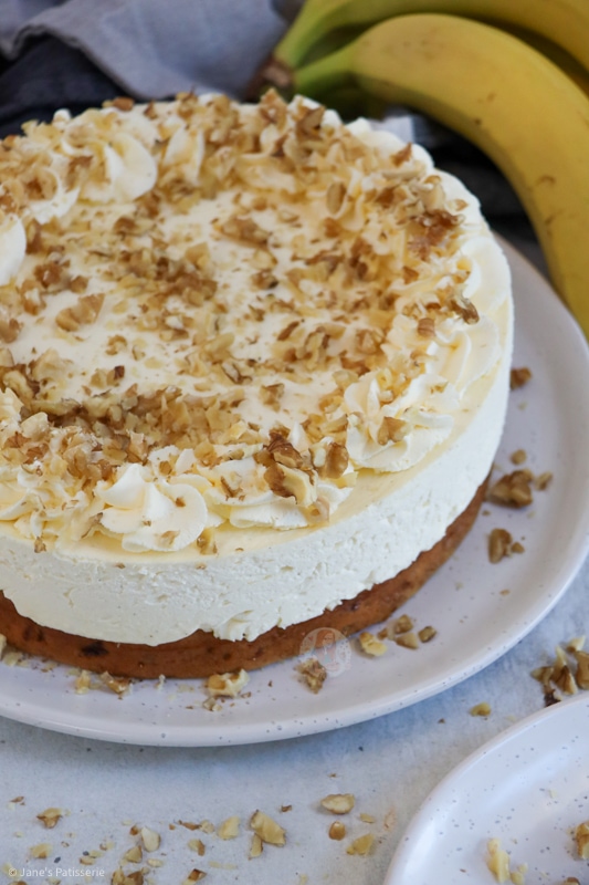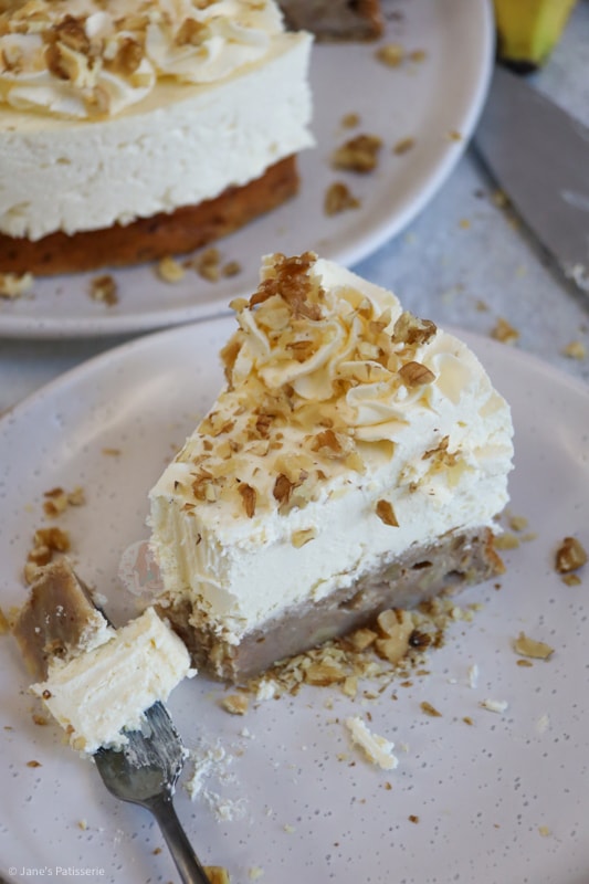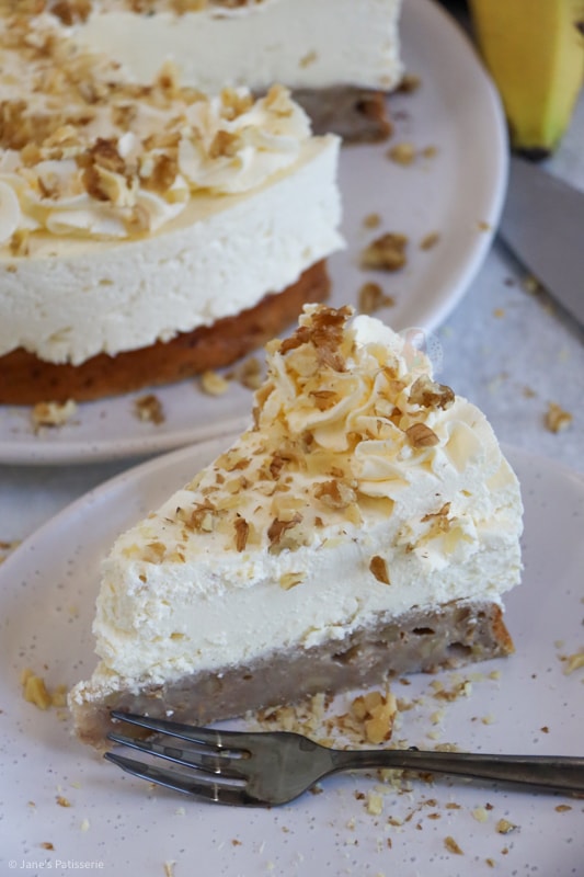 A delicious banana bread cheesecake with a banana bread base, and a sweet no-bake cheesecake filling on top – delightful!