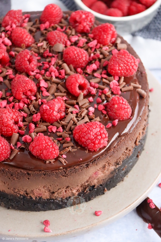 - Pour this on to the cheesecake and spread, and sprinkle on some chocolate curls, raspberries and freeze dried raspberries. Leave this to set for about an hour and then portion, and enjoy!