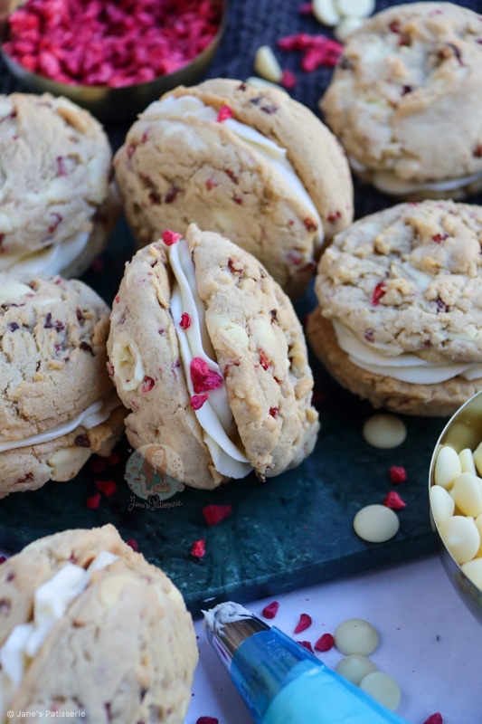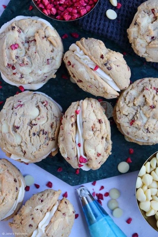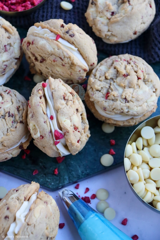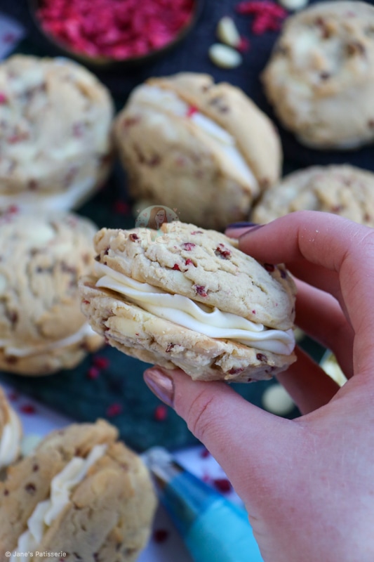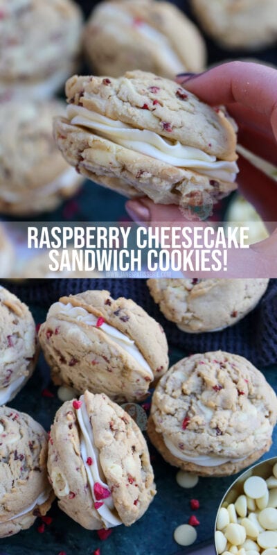 Delicious white chocolate and raspberry cheesecake cookies with soft delicious cookies and cheesecake sandwiched together!