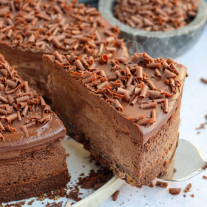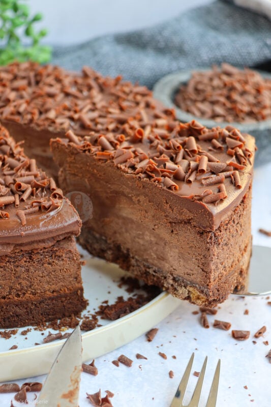 The ultimate chocolate overload cheesecake with a chocolate biscuit base, chocolate cheesecake, chocolate ganache topping, and more…