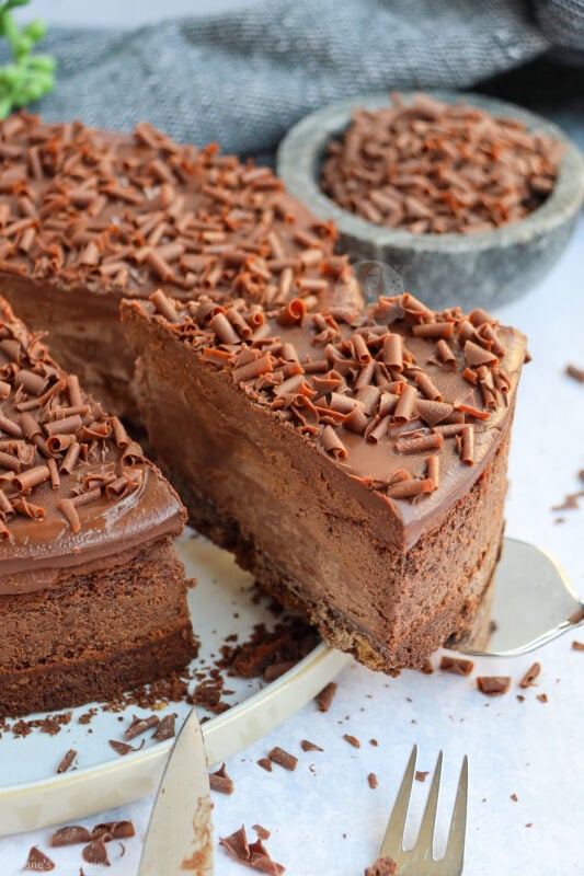 I used a mix of cocoa powder and melted dark chocolate in the filling, and it worked wonders. It may sound weird, but it doesn’t really matter if the chocolate goes a little lumpy in the mixture as once the cheesecake is baked, the lumps have disappeared!