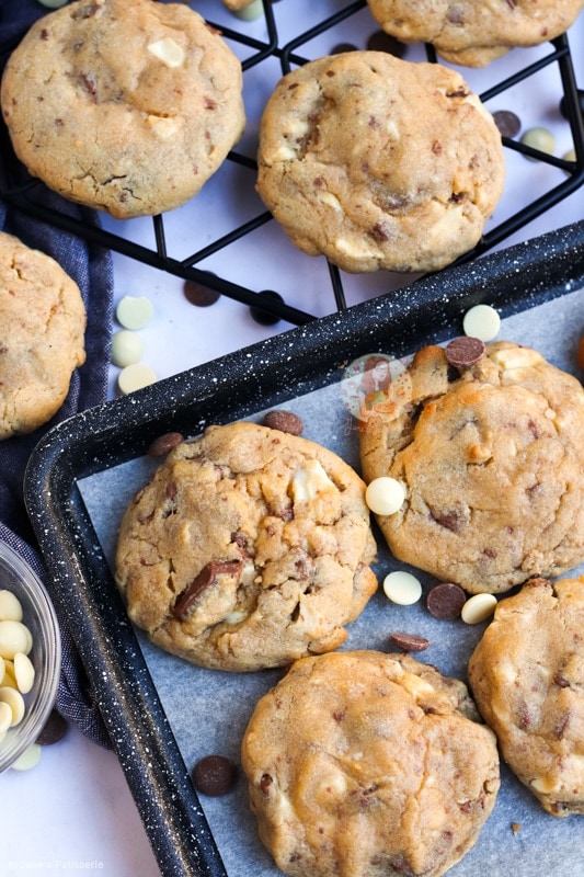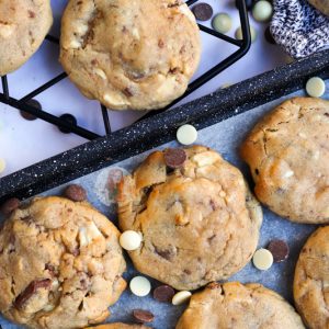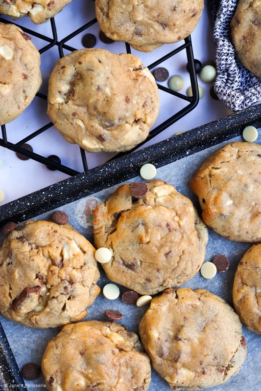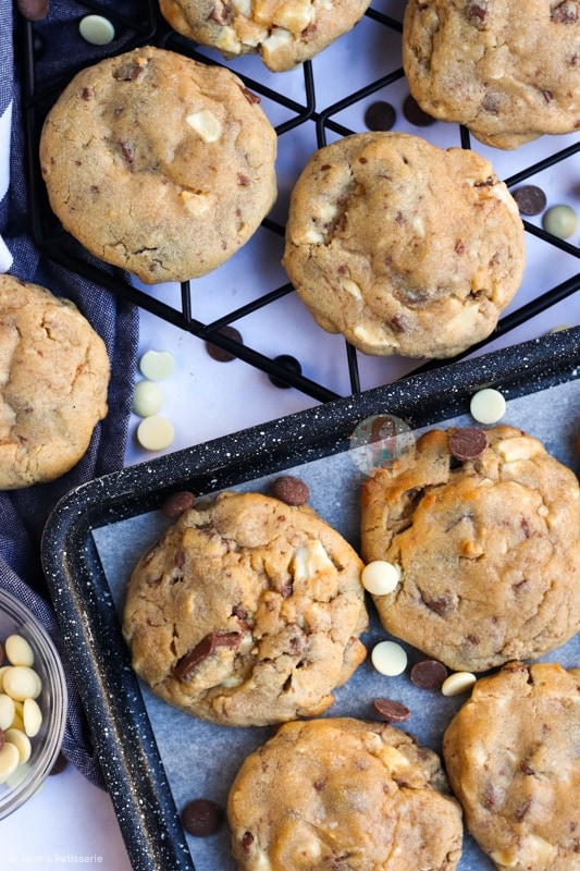 I used my normal 5cm cookie scoop when making these – I didn’t weigh the cookie dough. I find it far easier to just use a scoop for this style cookie, as it’s a consistent size, and it’s much quicker! If you do want to weigh them though, simply add all the ingredient weights together and divide by the quantity of cookies you are making.