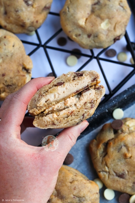 I used a mixture of milk and white chopped chocolate in these cookies rather than chocolate chips – the chocolate chips I use are quite large in my opinion and I wanted to make sure the chocolate was chopped finely enough so that the cheesecake filling wouldn’t ooze out! I just used a bar of chocolate and chopped it down.