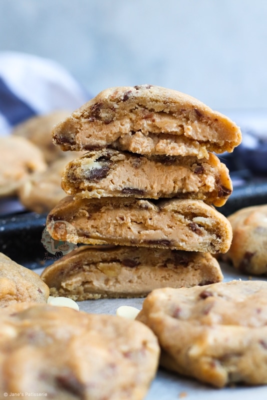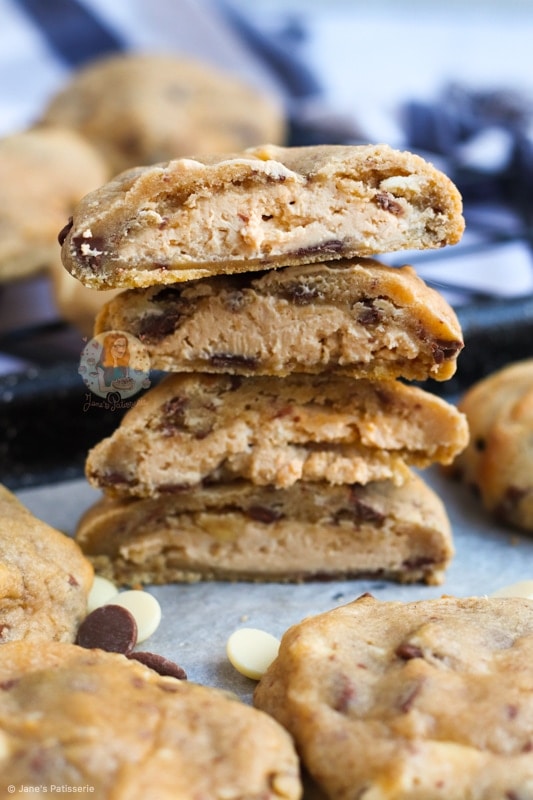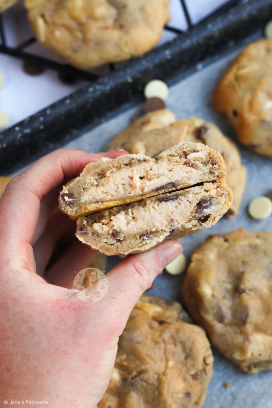 Whenever you make stuffed cookie dough, you have to make sure that the cookie dough is quite dry, and not sticky. If the dough turns out sticky, you may have to add in a bit more flour to counteract it – just to make rolling the cookie dough possible!