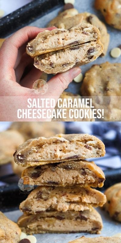 Easy and delicious chocolate chip cookies stuffed with a salted caramel cheesecake centre… my new favourite, salted caramel cheesecake cookies!