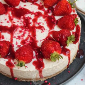 A deliciously creamy no-bake vegan vanilla cheesecake – with a biscuit base, vegan cheesecake topping, strawberry coulis, and fresh strawberries!