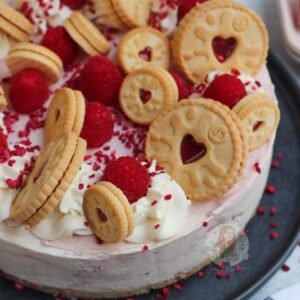 For the decoration of the cheesecake I did my usual sort of thing – piping whipped cream around the edges, raspberries, freeze dried raspberries and some more Jammie Dodgers. How could I possible resist adding in some more Jammie Dodgers?! The more the merrier.