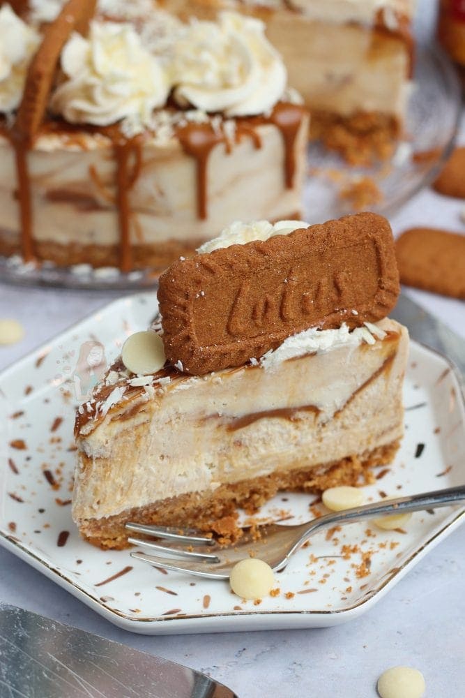 A delicious no-bake white chocolate and Biscoff swirl cheesecake with a buttery biscuit base, white chocolate cheesecake filling swirled with Biscoff spread, topped with whipped cream, and even more Biscoff!
