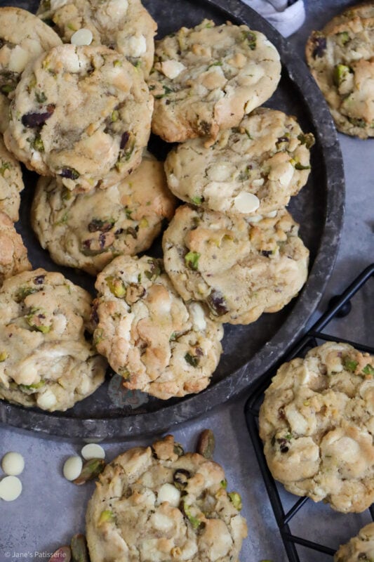 Add the white chocolate chips and pistachios and mix through until they’re distributed evenly, and then you can portion the cookies onto a tray. I use this 5cm cookie scoop to portion the cookies because it’s SO easy, and the recipe makes 15-18 cookies. You can use this recipe for NYC Style cookies if you fancy, just follow the method on the NYC posts.