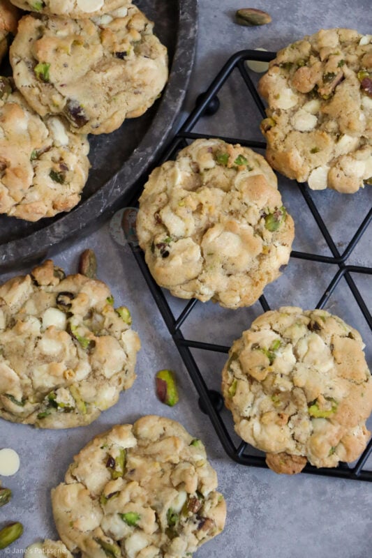 Easy white chocolate and pistachio cookies with a white chocolate chip and pistachios chopped throughout – so good and so easy.