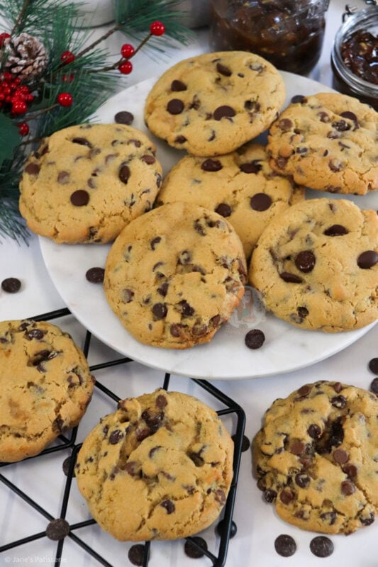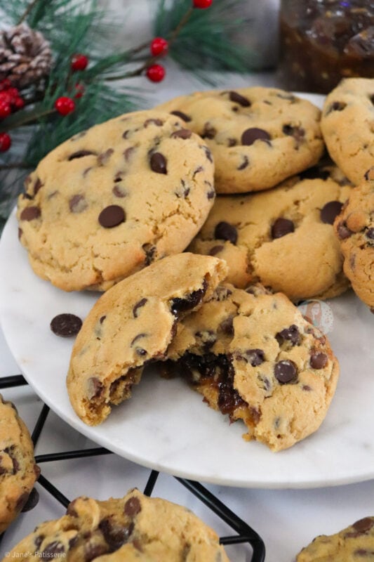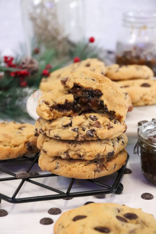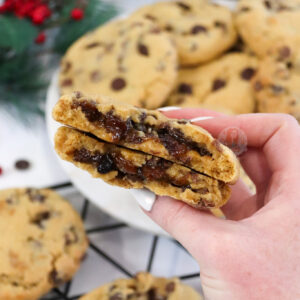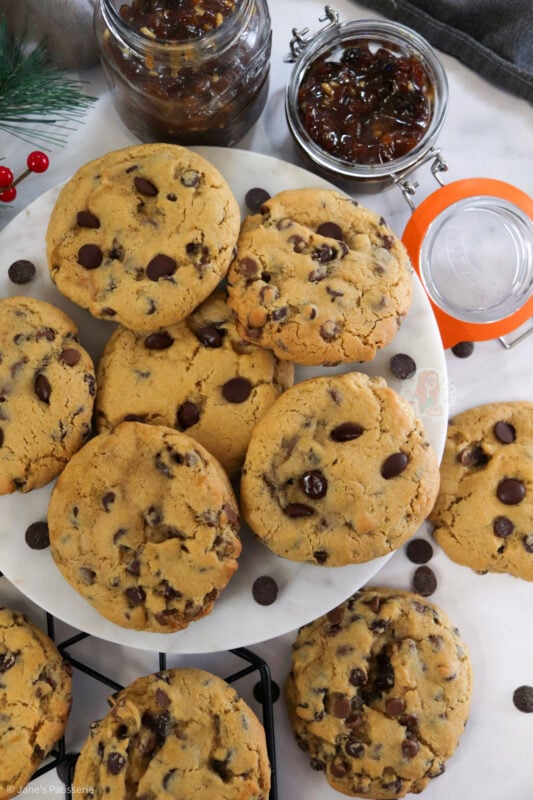 Delicious chocolate chip cookies stuffed with mincemeat to make scrumptious mince pie cookies!