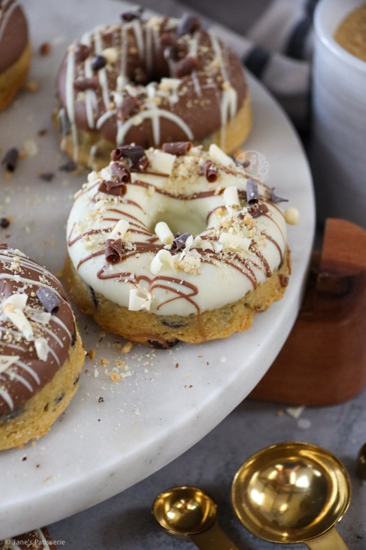 I melted some white chocolate and some milk chocolate separately, and dunked a nicely chilled cookie doughnut into the chocolate. I usually wiggle them about a bit to knock off any excess chocolate.