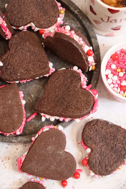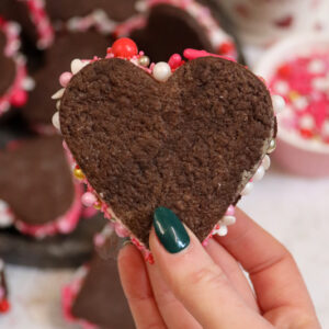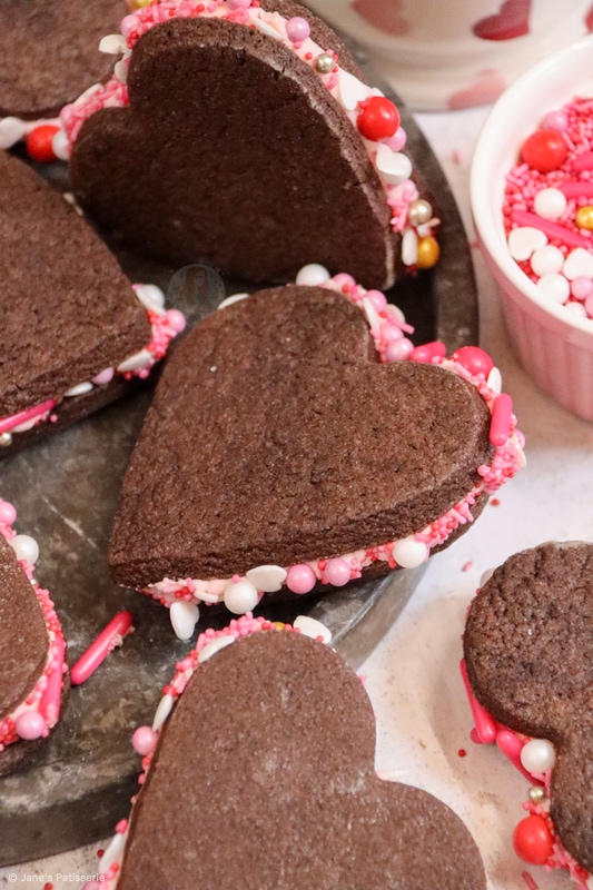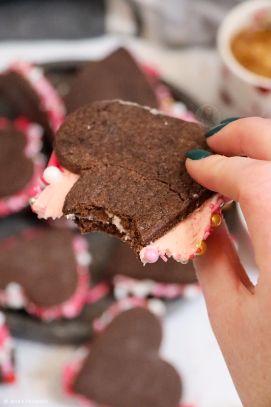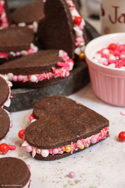 Delicious valentines sandwich cookies with a soft chocolate cookie, silky smooth frosting with sprinkles, perfect for Valentine’s Day!