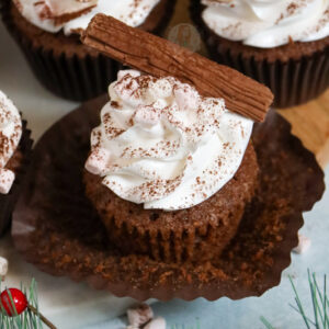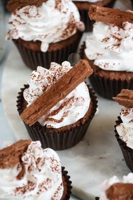 I wanted the decoration of the cupcakes to represent the look of a beautiful hot chocolate, and it worked wonderfully! Of course, if you wanted to be a bit more classic to the idea of hot chocolate, you can use whipped cream to decorate the cupcakes instead. I would whip up 450ml of double cream with 2tbsp of icing sugar to soft peaks and pipe that onto the cupcakes instead.