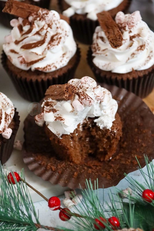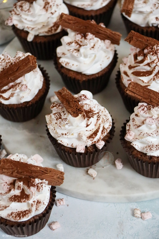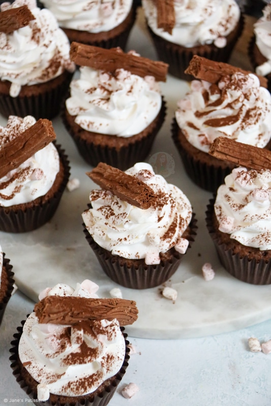 Delicious hot chocolate cupcakes with a hot chocolate sponge, marshmallow frosting and more – my favourite hot drink in cupcake form!