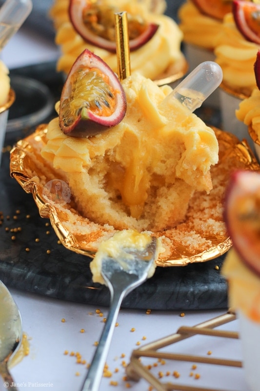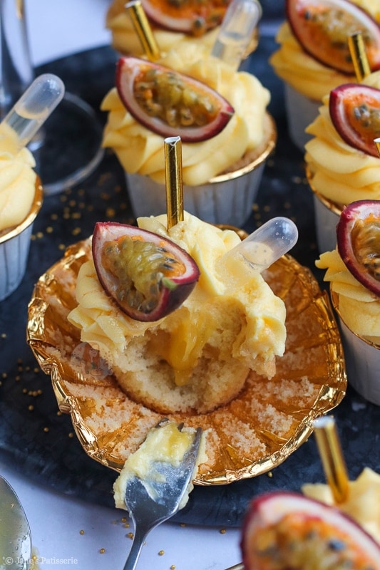 - Once cooled, core out the middle of each cupcake and add a spoonful of passionfruit curd.