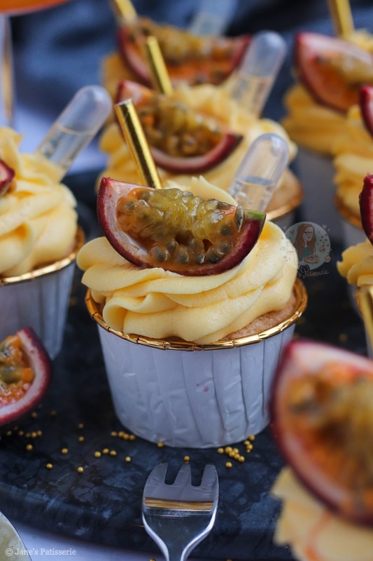 - I then added a quarter of a passionfruit per cupcake, and part of a gold straw for looks.