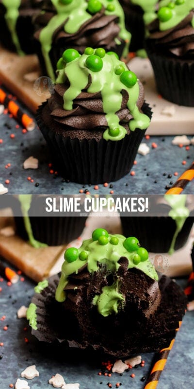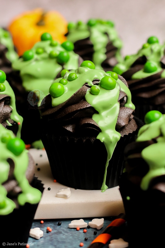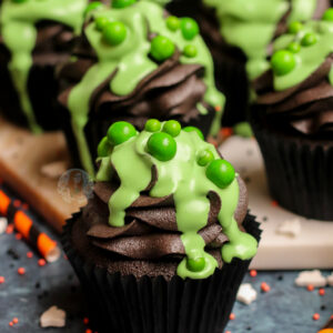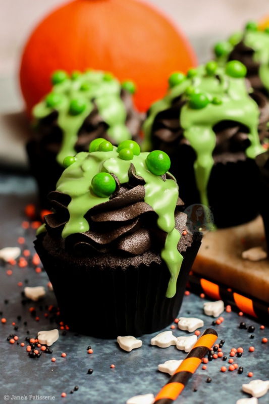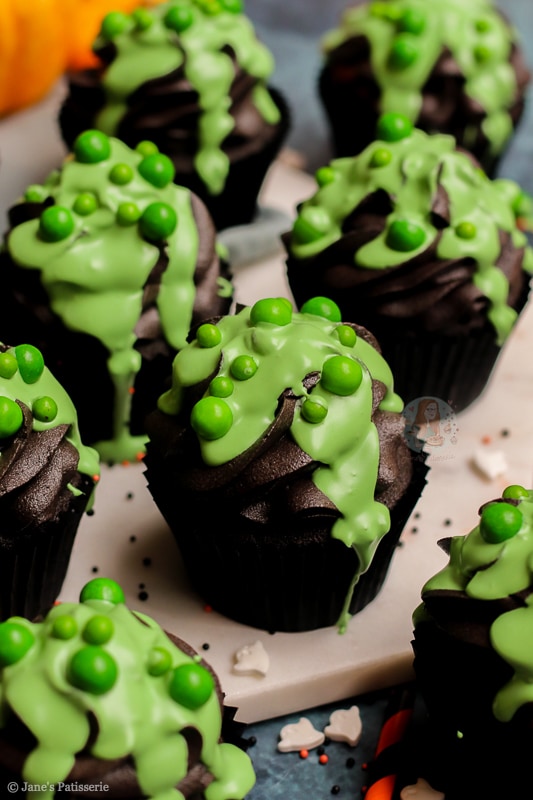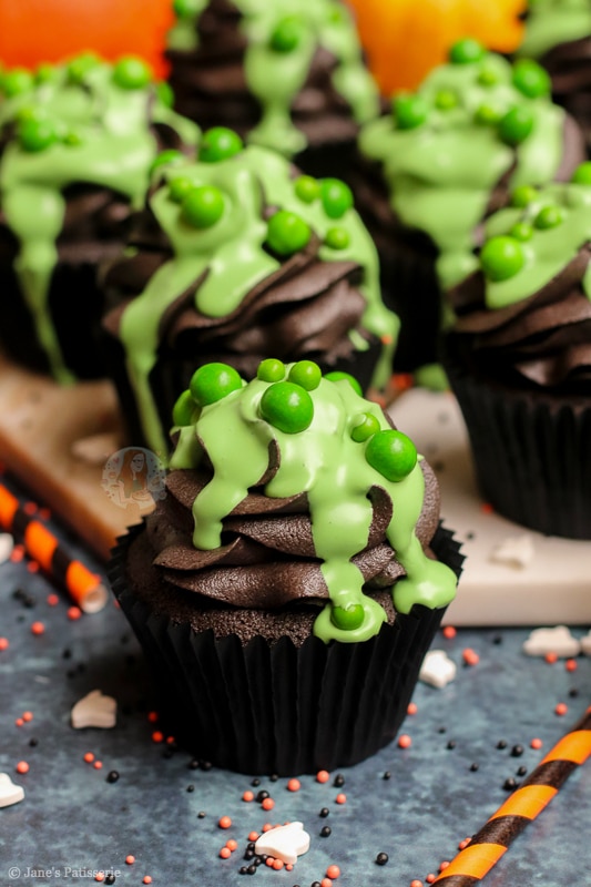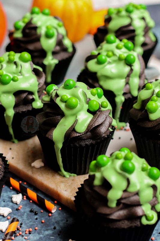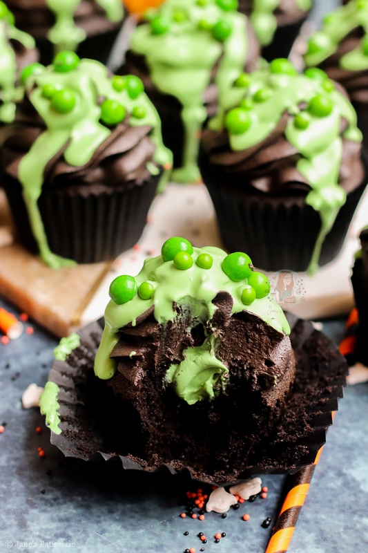 Delicious scaretastic slime cupcakes with a black chocolate sponge, chocolate black buttercream frosting, and a gooey white chocolate slime drizzle and centre!