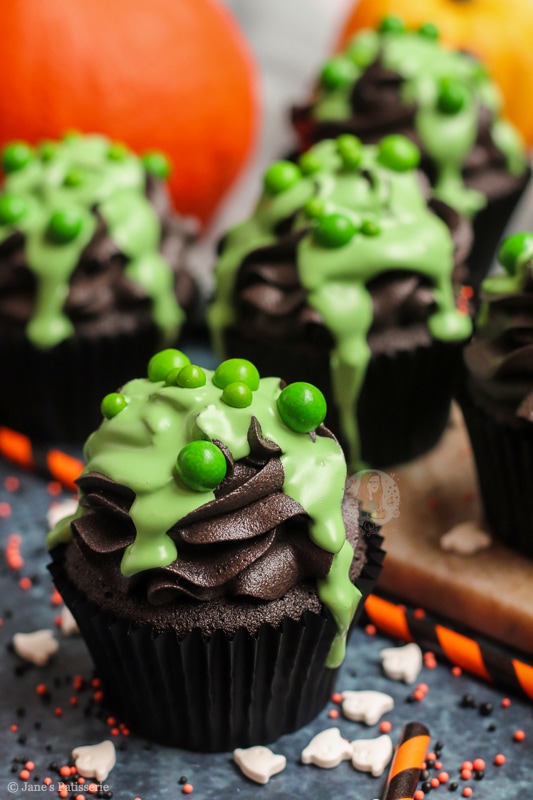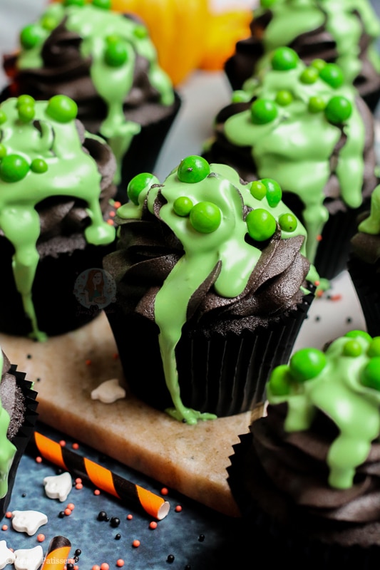 Baking these into these beautiful black cases makes something heavenly delicious – but also a little weird looking. It is black cake after all! However, using the buttercream frosting and the green slime ganache contrasts so much better against the black colour.