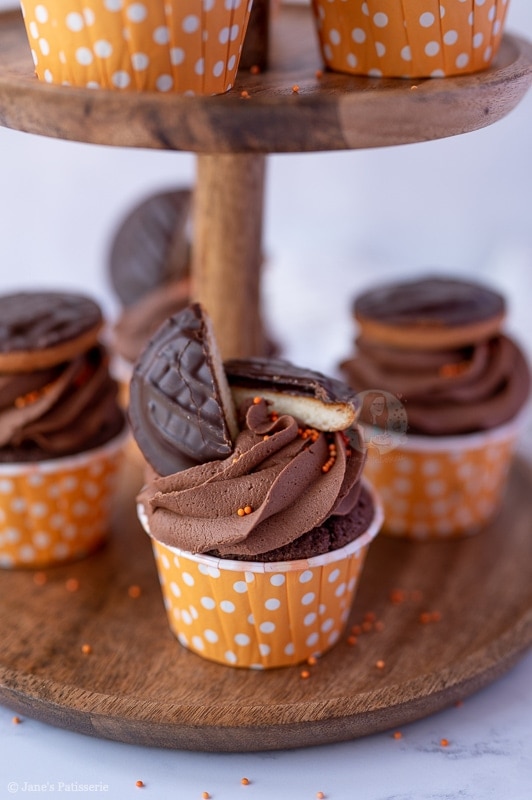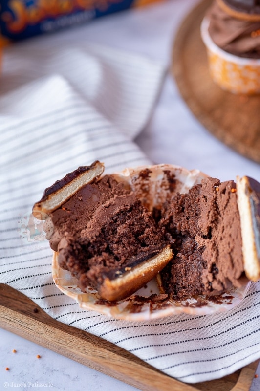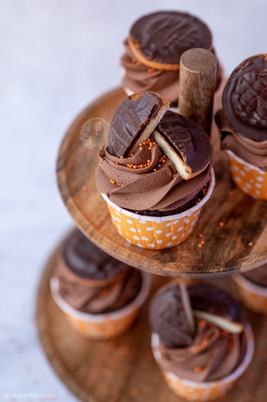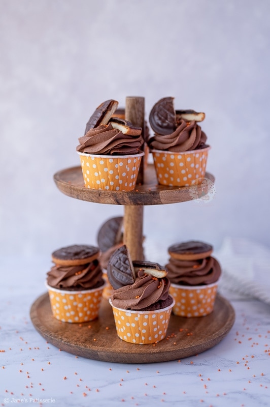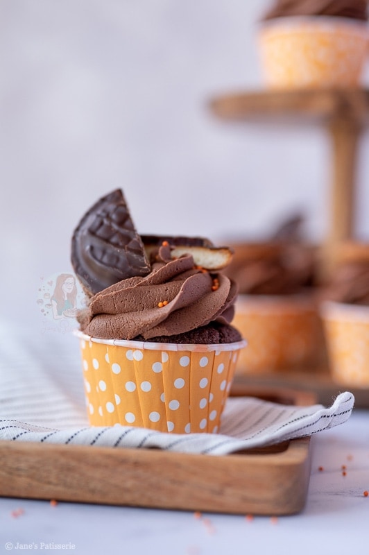Scrumptious chocolate and orange Jaffa Cake cupcakes with a hidden Jaffa Cake, chocolate buttercream frosting and a Jaffa Cake on top!