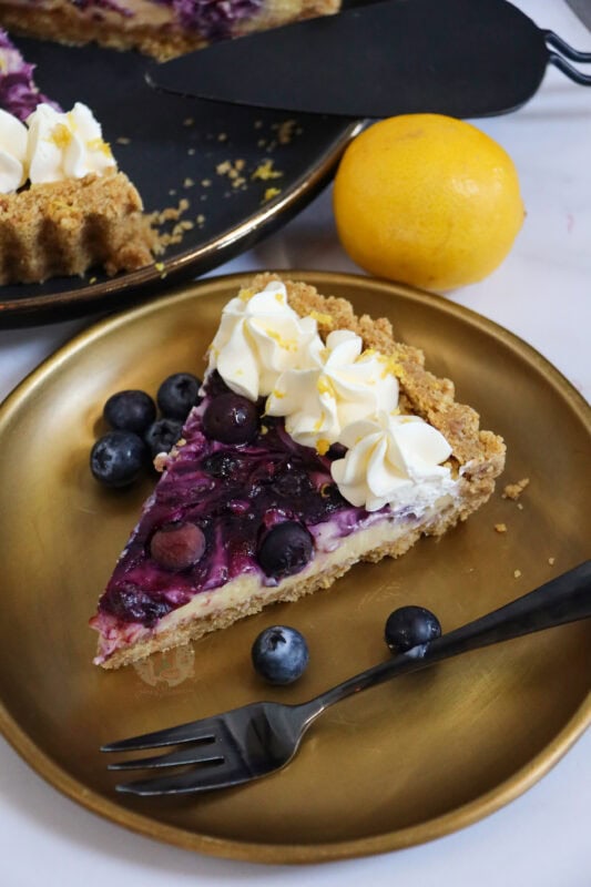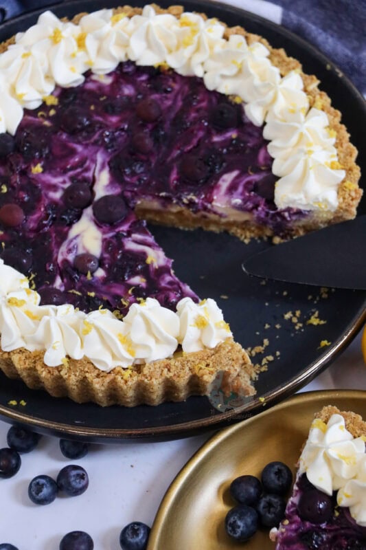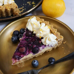 A creamy lemon blueberry tart with a biscuit base, lemon filling with a blueberry coulis swirl and whipped cream on top – perfect summer bake.