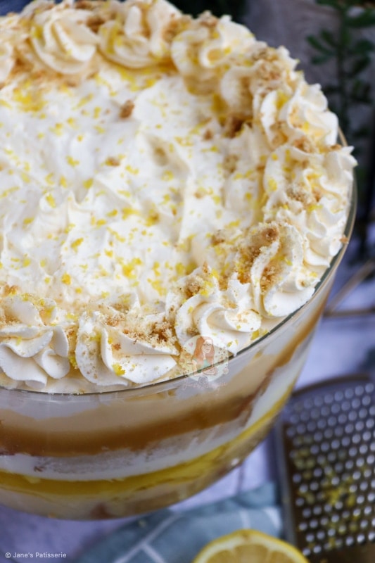 I finished the trifle off with some lemon zest sprinkled over, and some biscuit crumbs to act like sprinkles as I thought it looked nice – but again, this is up to you. I used a 21cm trifle bowl for this – but trifle bowls really can vary in size! You don’t have to really use a trifle bowl exactly, just a large dish that is deep enough -good luck finding one though!