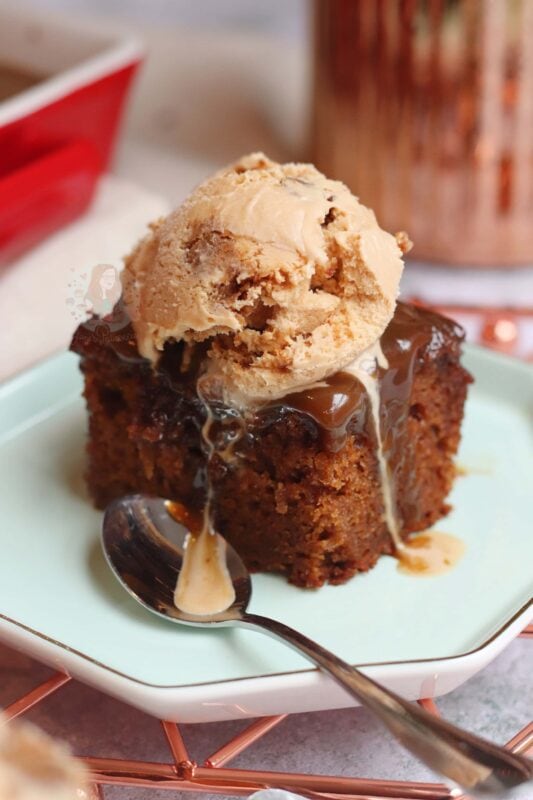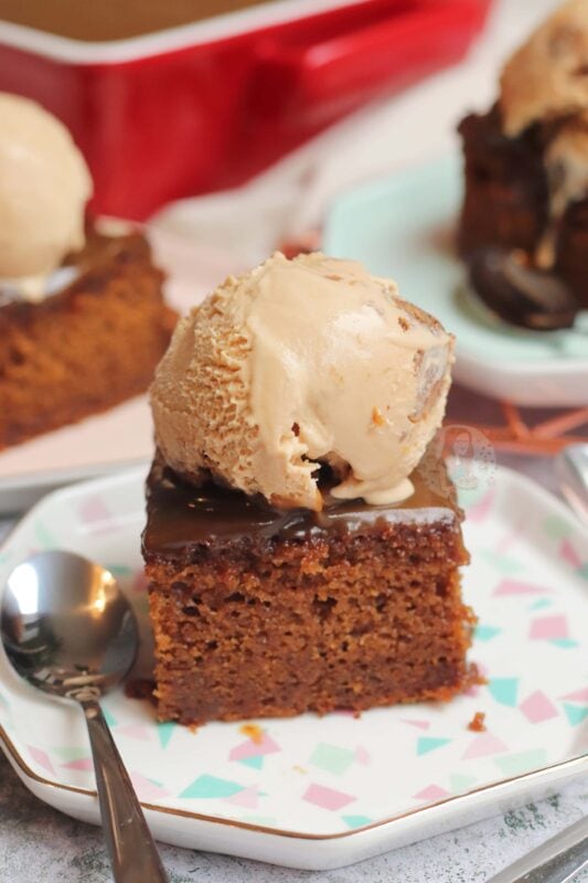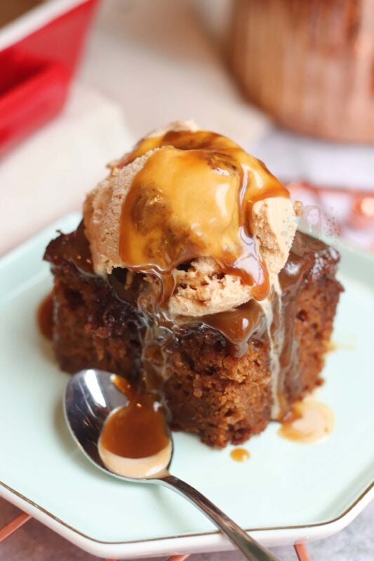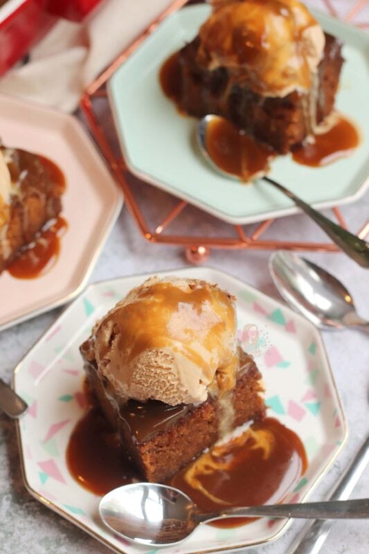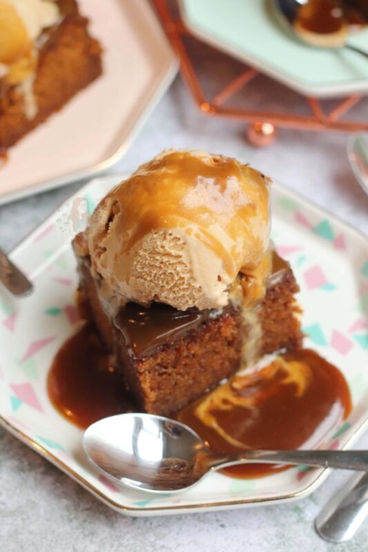 My favourite flavours of ice cream to go with a dessert like this are clotted cream ice cream, and toffee ice cream – but maybe that’s a little too much sticky toffee in one go? Or, if you have a giant glug of custard, I’m not going to be mad about it…