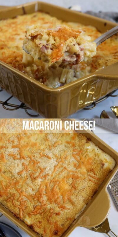 A deliciously cheesy macaroni cheese with homemade cheese sauce, crispy bacon and a breadcrumb topping… a homemade dinner idea that is easy and heavenly!