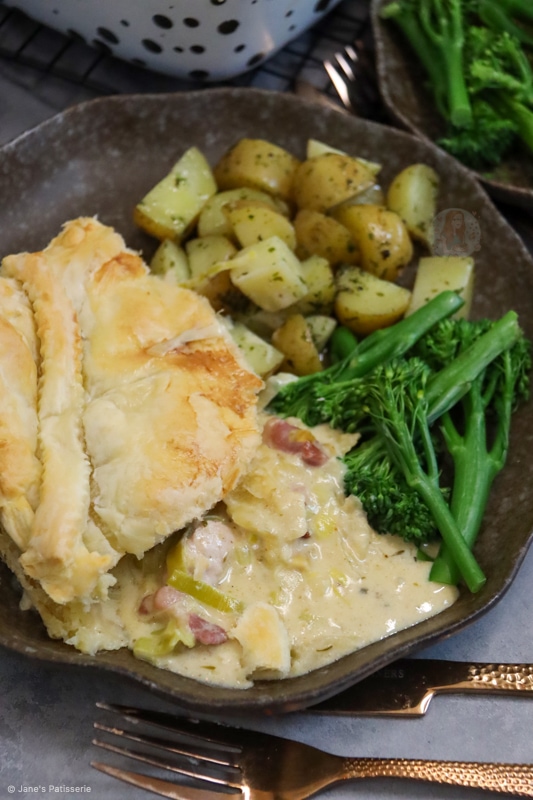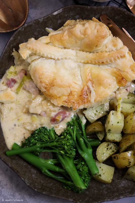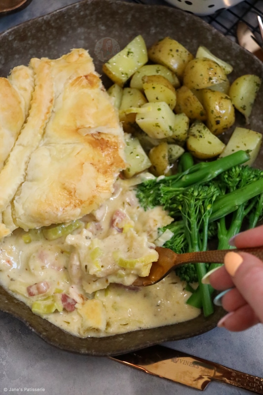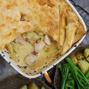 Once this delicious chicken, leek & bacon pie is ready, you can serve it… salad, new potatoes, veg, roasties, whatever you want! It suits many side dishes.