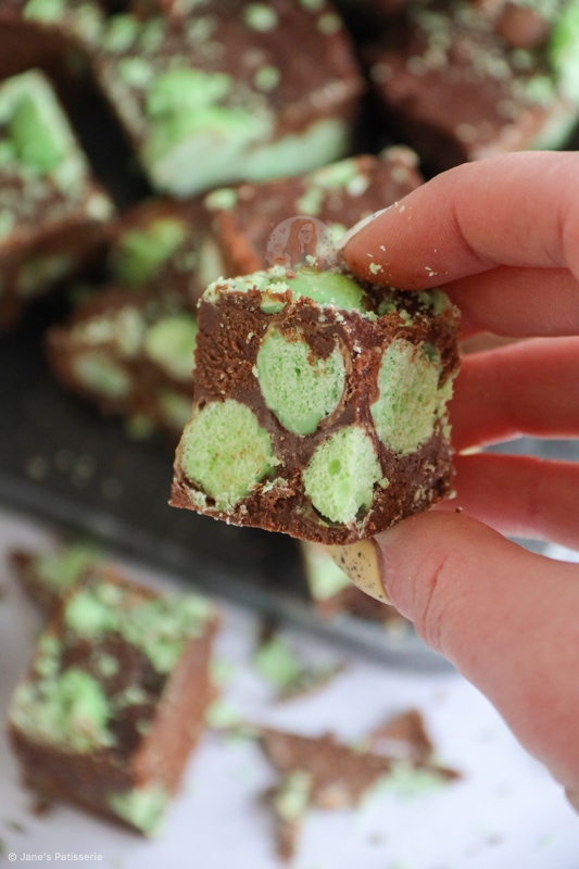 - Sprinkle on some Mint Aero crumbs, and some whole bubbles/pieces and press into the top of the fudge and store in the fridge for at least 5-6 hours (Or preferably overnight) to set!