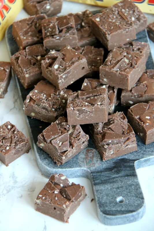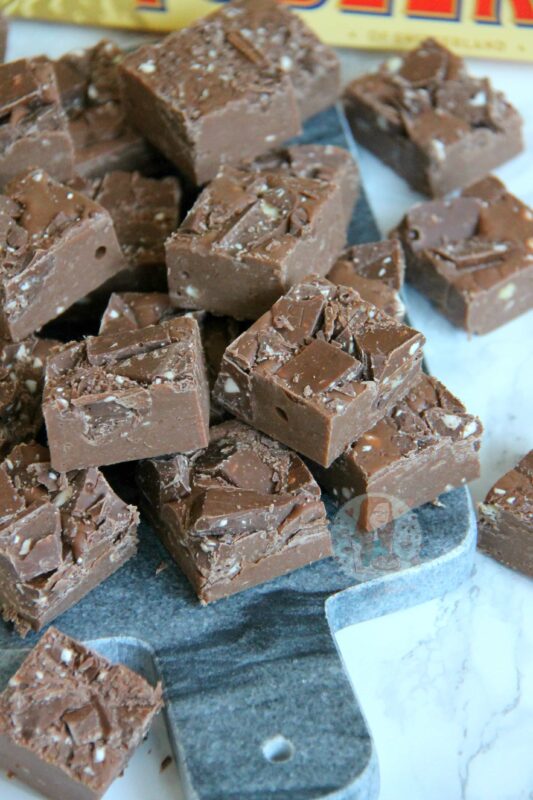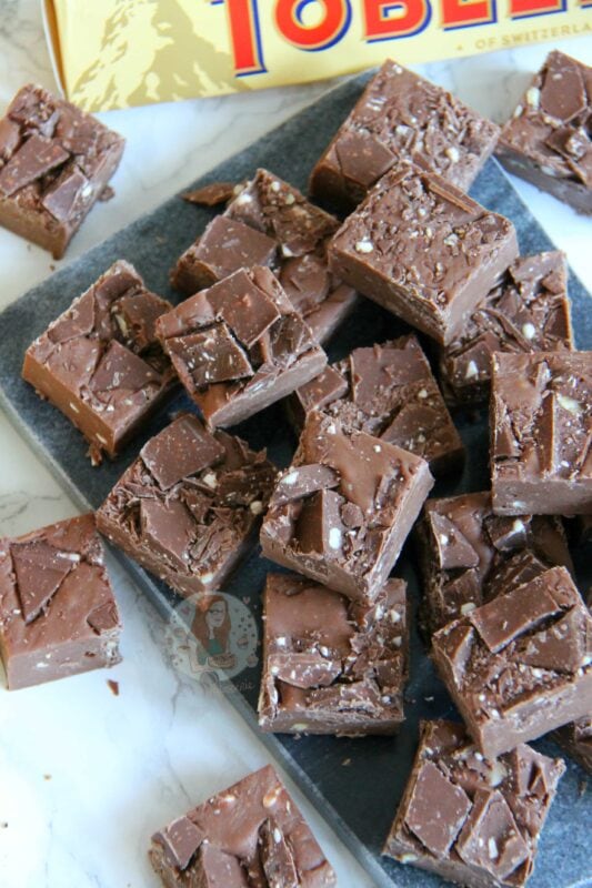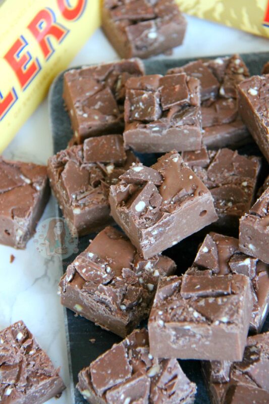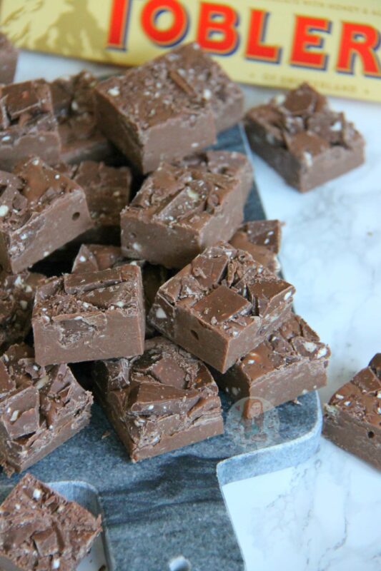 You can of course try a ‘proper fudge’ instead of a condensed milk fudge like this one, but you run the risk of it splitting because of how the Toblerone is made. To be honest though, I don’t know if this WILL happen as I have never tried it, but as it’s not just chocolate on its own, it sure is a risk! However, if you did want to try it, I recommend basing it on my white chocolate fudge recipe.
