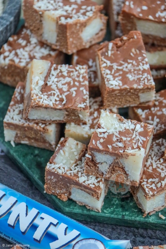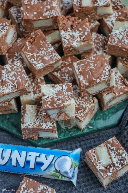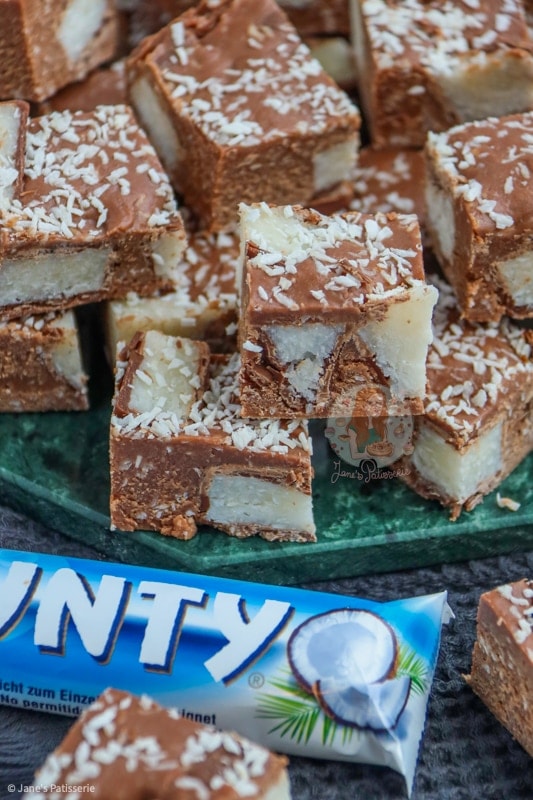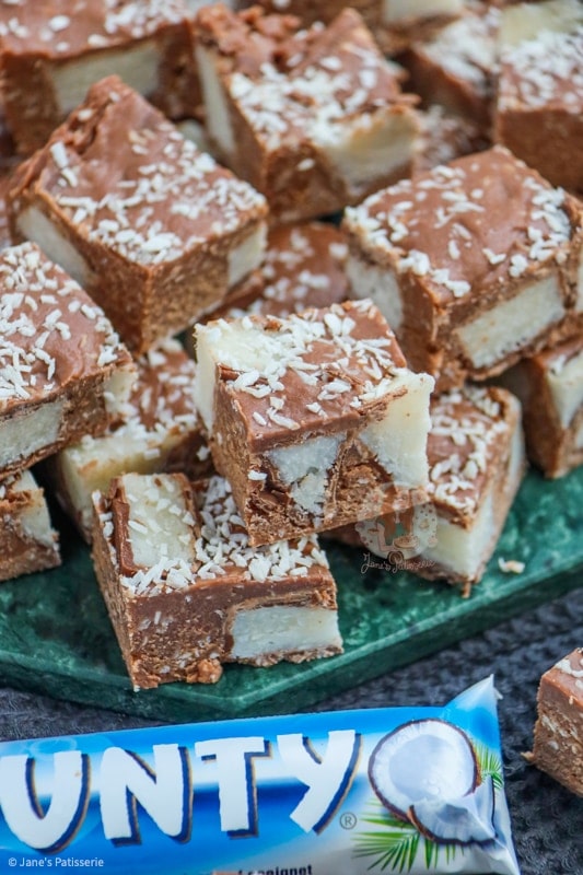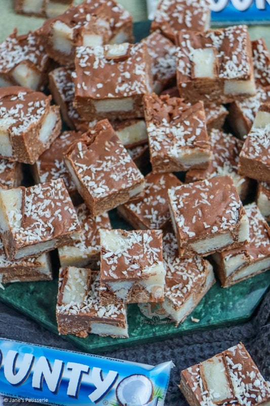 - Recipe updated January 2022 - the original recipe contained 397 condensed milk, 500g milk chocolate, 200g bounty spread, 100g icing sugar, 400g bounty bars and a sprinkling of desiccated coconut.