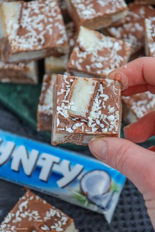 A delicious coconut and chocolate bounty fudge… SO easy to make and so deliciously coconutty and chocolatey that you’ll want to make more then one batch!