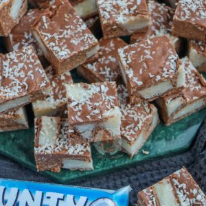 - Pour into the tin and smooth over the mixture. Sprinkle on the rest of the desiccated coconut and bounty bar bits and press down slightly so it sticks to the fudge. Store in the fridge for 5-6 hours to set, or overnight!