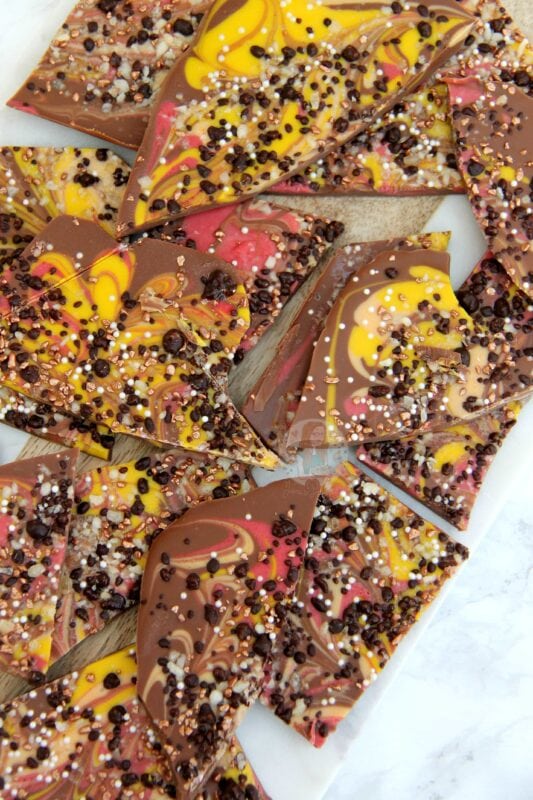 I personally make chocolate bark all of the time as I’m so busy at the moment, and it is soooo quick and easy, but when it comes to themed chocolate bark?! How FUN.