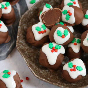 They are covered in a delicious milk chocolate shell, drizzled with a white icing, and decorated with mini holly leaves! Everyone always gives such good compliments about these – and they are the perfect little gift for Christmas! I do struggle to share them slightly, as they’re just delicious to be honest.
