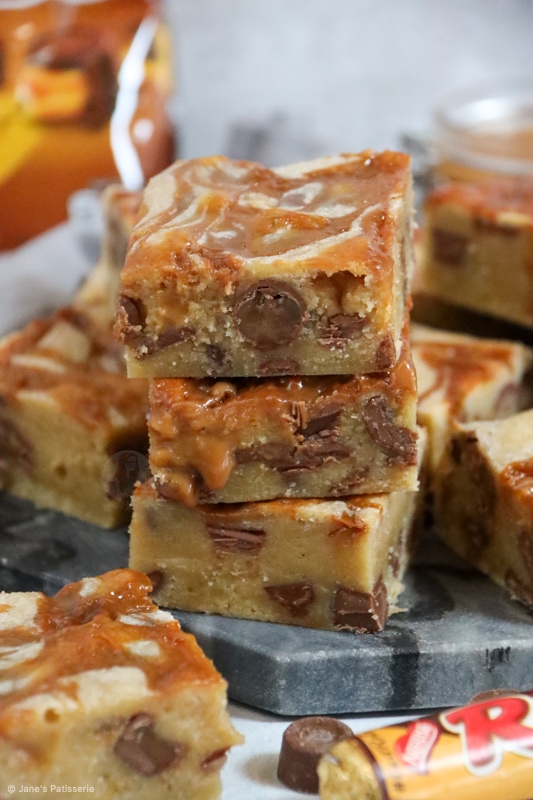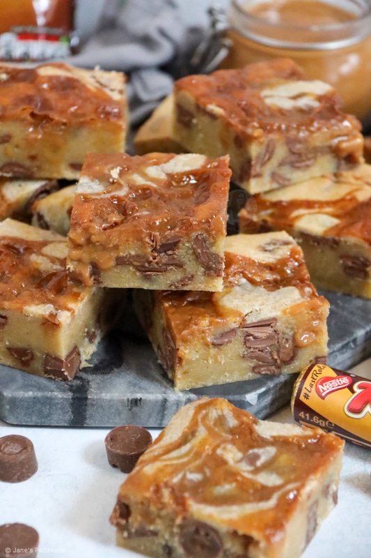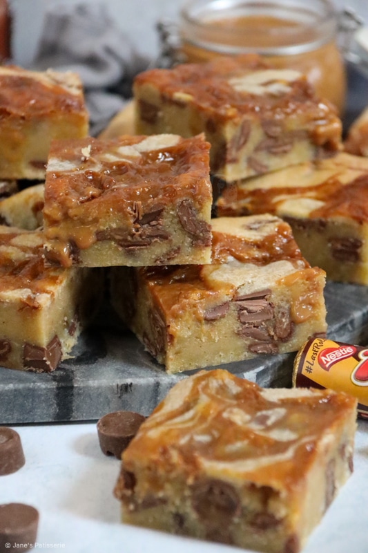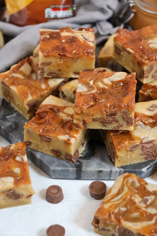 You can use a tinned condensed milk style caramel, or a dulce de leche, or any other thick caramel sauce that may take your fancy. You simply have to swirl it in ever so slightly into the blondie batter once it’s in the tin and bake.