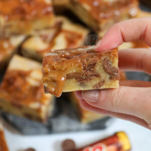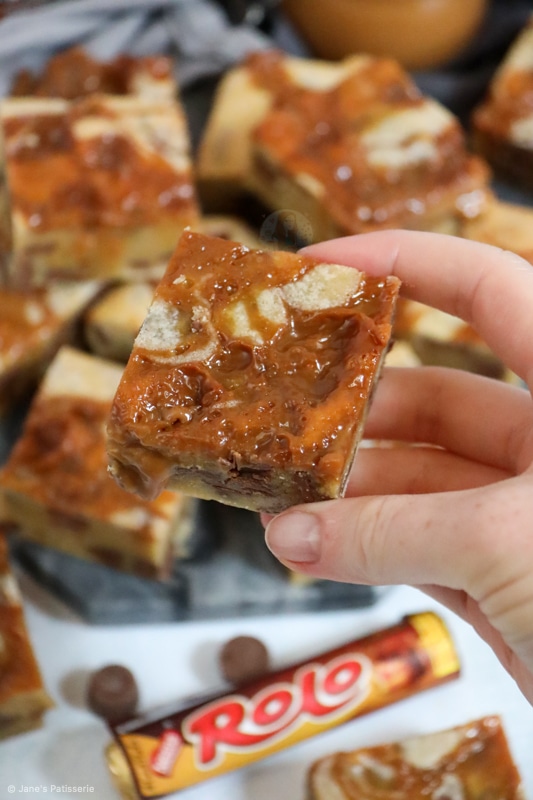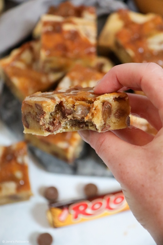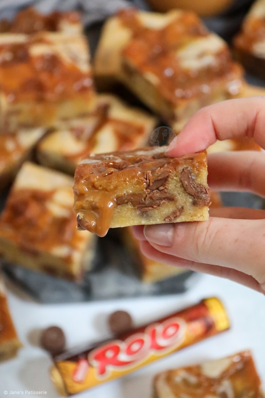 I know I am obsessed with Rolos, with recipes such as my Rolo Brownies, my Rolo Cookie Bars and all my other Rolo bakes… but these ones?! These Rolo blondies?! Oh my days.