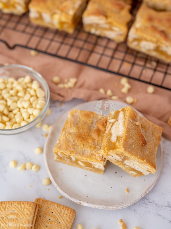 - Bake the custard cream blondies in the oven for 25-30 minutes, or until there is a slight wobble in the middle. (See notes below)