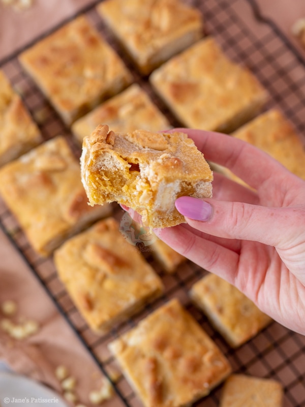 I will say now, as I do in all my blondies at the moment, I do not use a melted white chocolate base. Technically, a blondie is a non-chocolate brownie – so without the cocoa or dark chocolate. They are also known as white chocolate brownies, but I don’t actually like using white chocolate with this recipe!