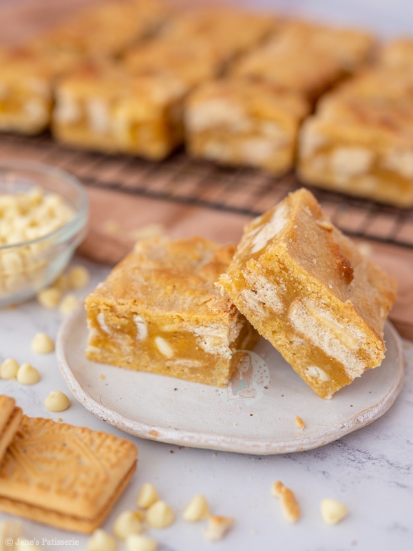 I find when adding the melted white chocolate to this recipe changes it and it just doesn’t taste as nice! I will produce a white chocolate one in the future, but for now… please just stick with this recipe as it is. It’s a blonde coloured traybake = blondie!