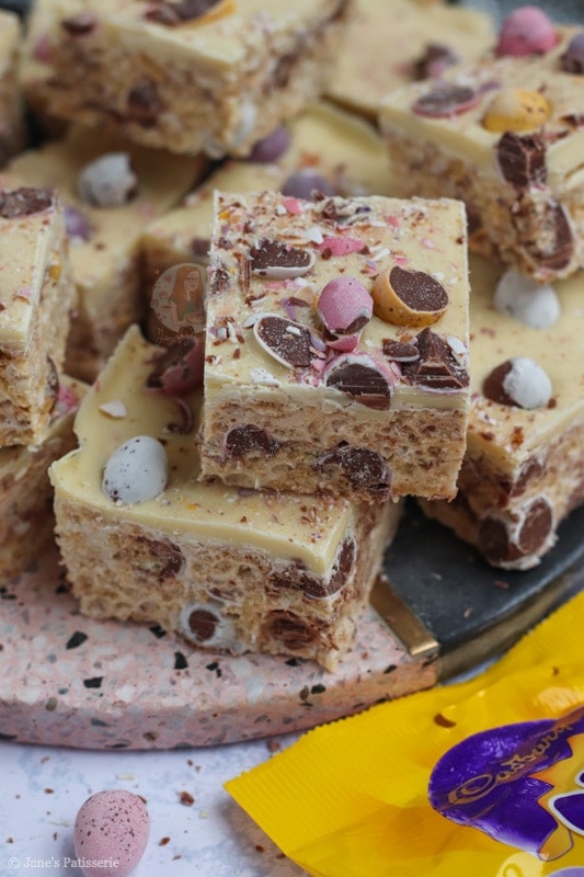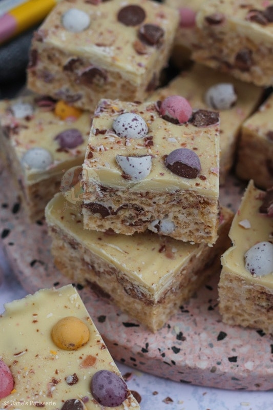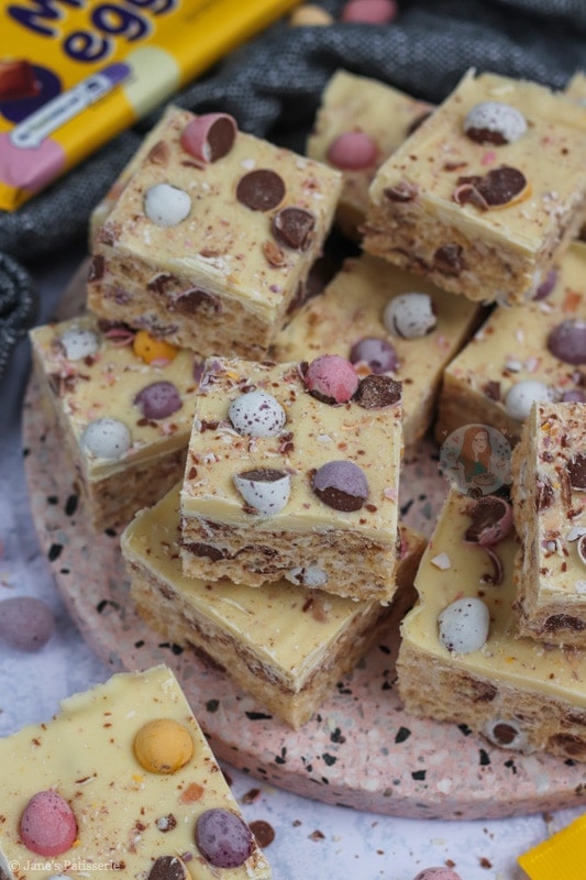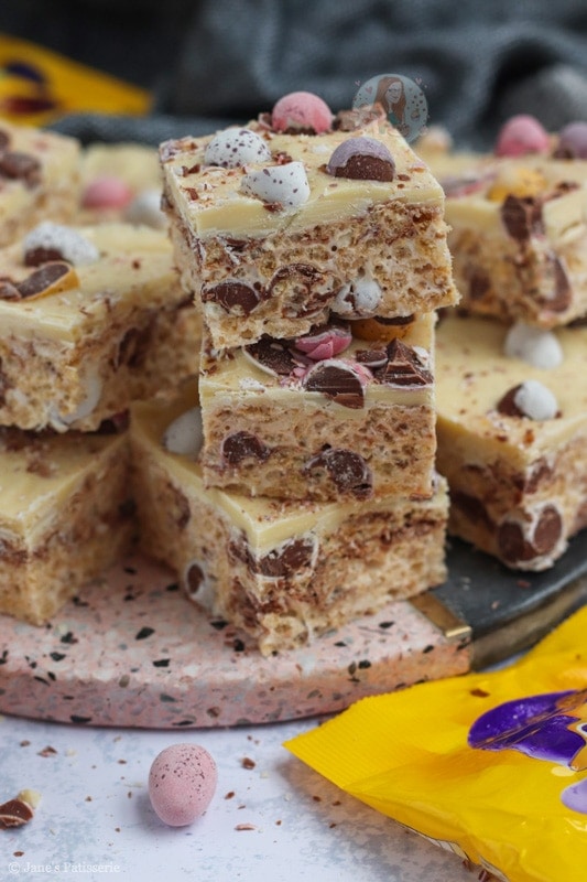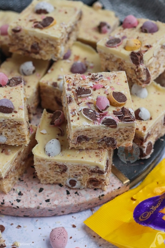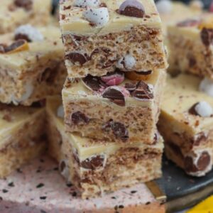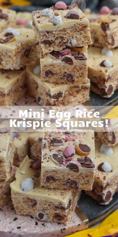 Easy five ingredient Mini Egg Rice Krispie squares with a white chocolate mini egg topping!