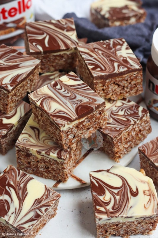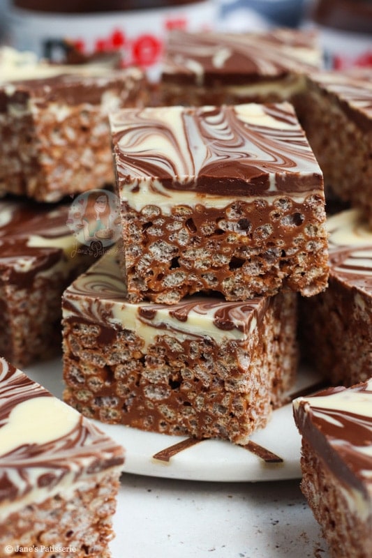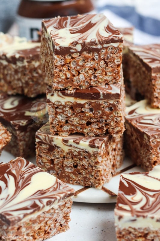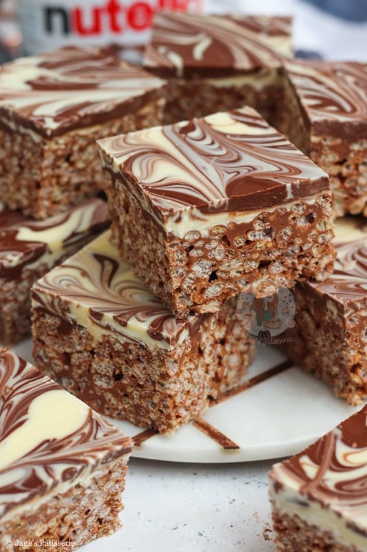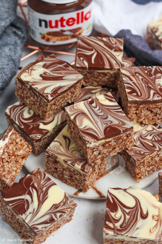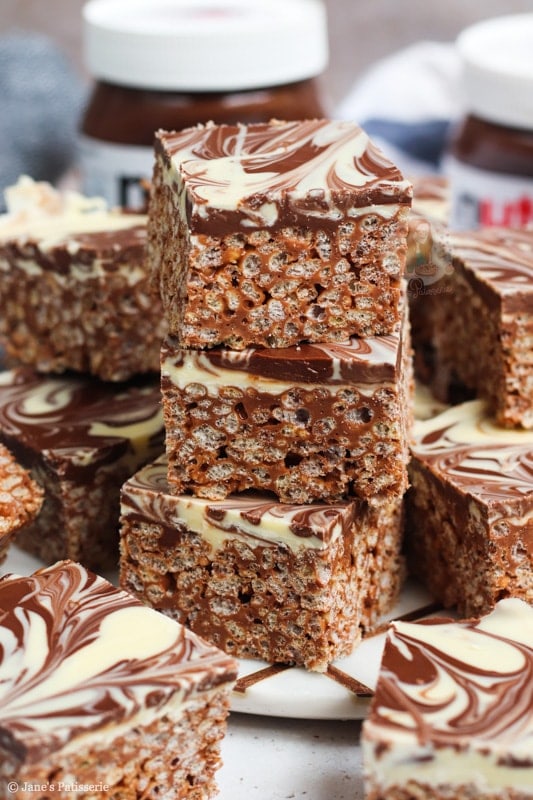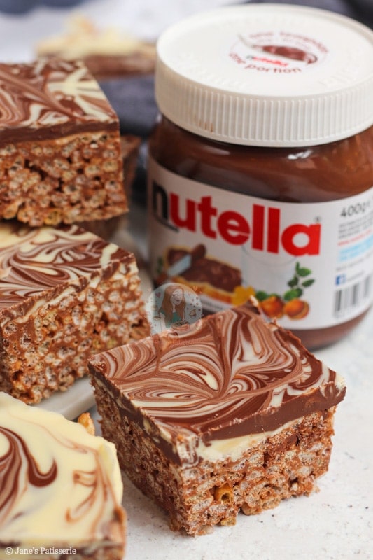 In the UK at least, we have Maltesers spread, Crunchie spread, M&M spread… etc! They would all work perfectly in place of the Nutella. You just need to make sure that when you are making the rice krispie base of the butter and marshmallows, to take it off the heat before you add the spread. If the spread gets too hot it can split!
