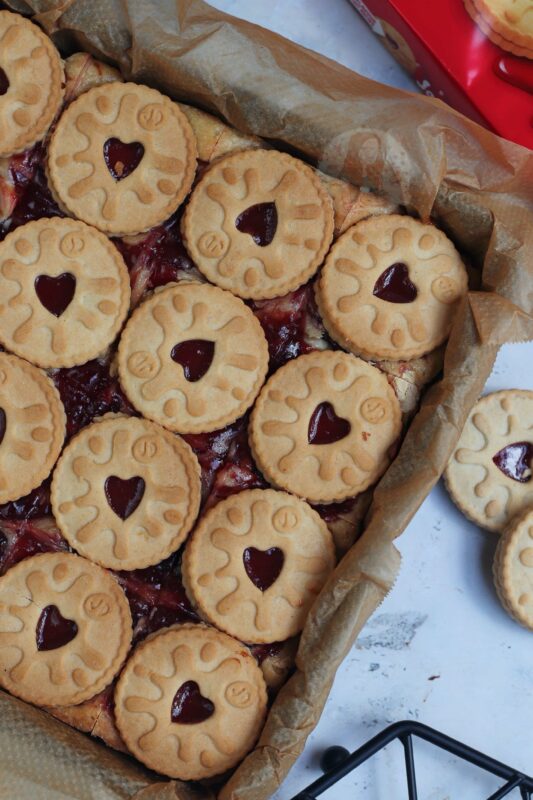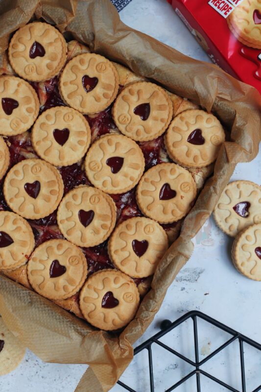 If your blondies still seem raw, you may have over mixed the mixture (just like brownies taking longer in some ovens!) – cover in foil, and bake in 5-minute increments. If you are unsure, once the jammie dodger blondies have cooled fully – you can ‘set’ them in the fridge for a few hours which will firm them up nicely, give the best texture, and make them easier to cut!