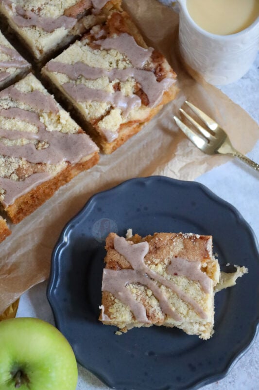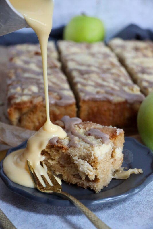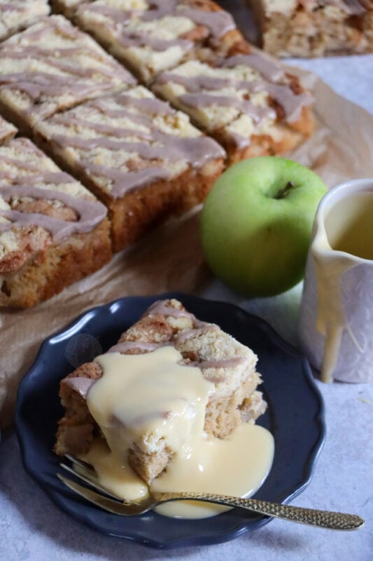 A delicious spiced apple crumble traybake cake with a sweet apple & cinnamon sponge, and a homemade crumble on top!