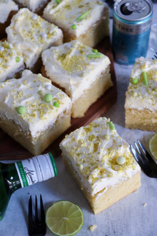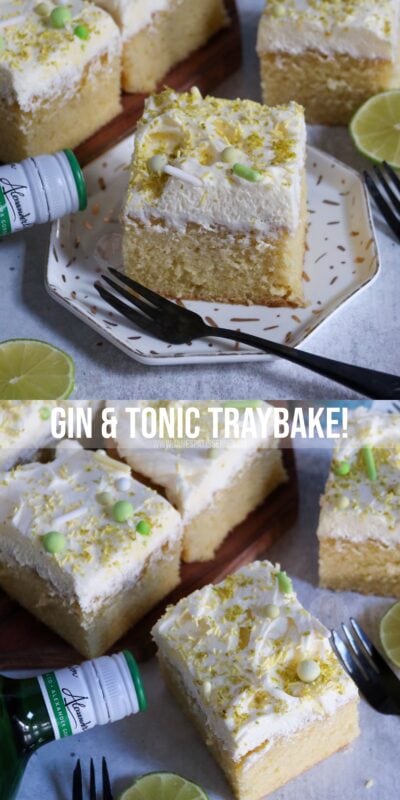 A delicious and delectable gin and tonic traybake cake with gin and tonic drizzled sponge and gin infused buttercream frosting!